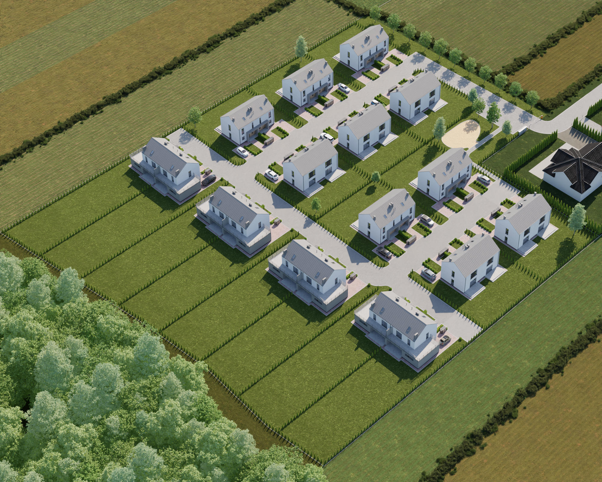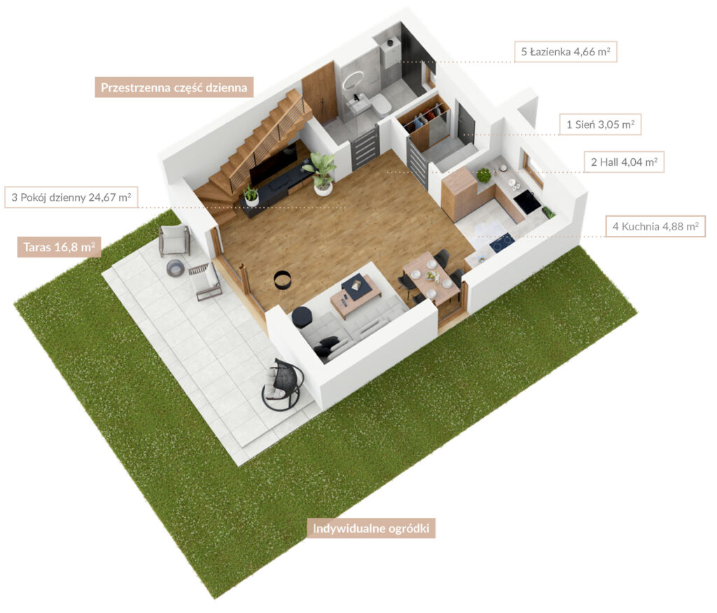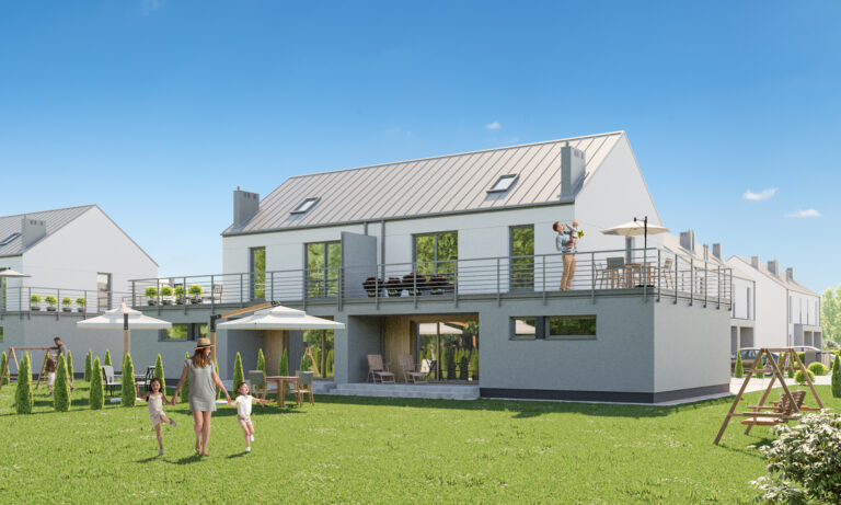 Do każdego domu przynależy indywidualny ogródek, w którym możesz odpoczywać na świeżym powietrzu, bawić się z dziećmi, uprawiać warzywa i owoce czy spotykać się z bliskimi przy grillu. Większe domy mają także duży balkon na pierwszym piętrze. Budynki zostały wykonane przy wykorzystaniu proekologicznych materiałów oraz technologii. Zadbano o wysokiej klasy izolację termiczną i akustyczną.