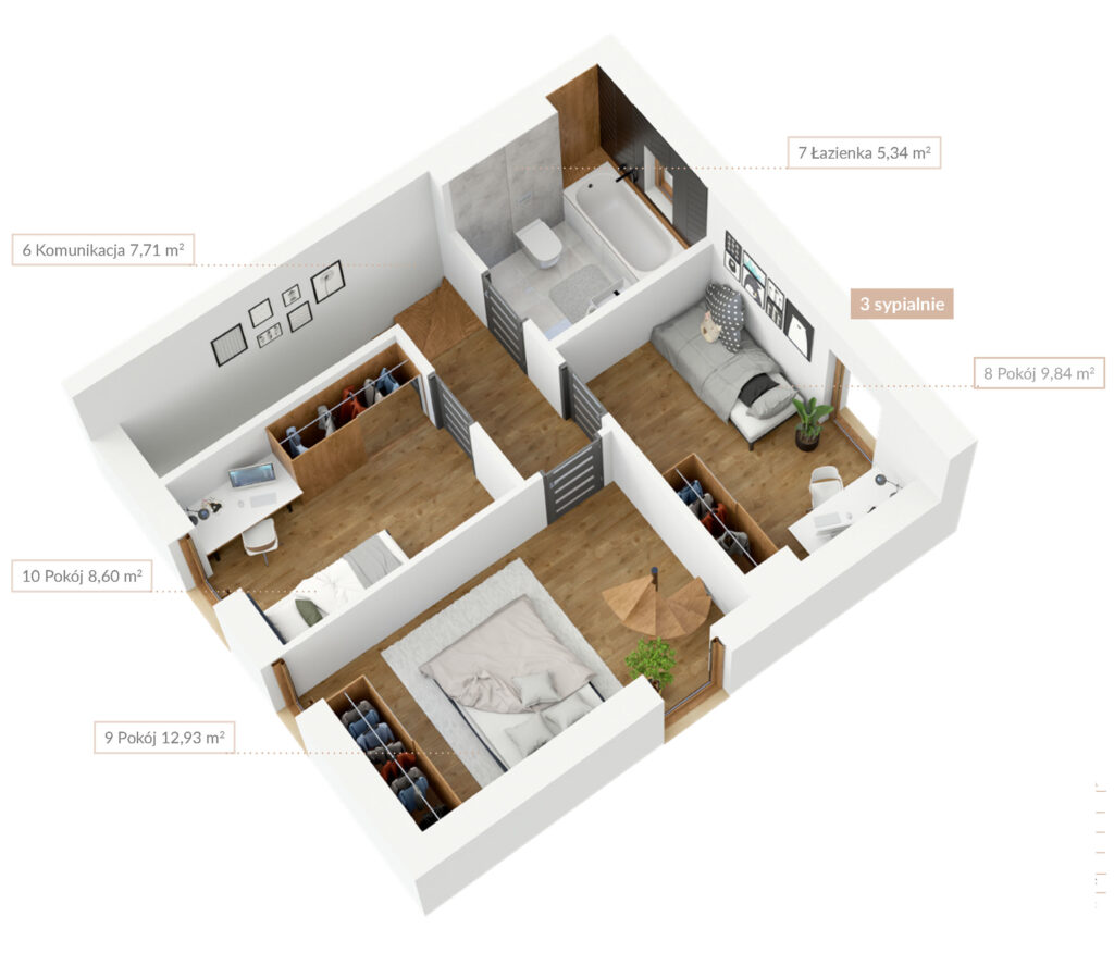 Domy wyróżniają się funkcjonalnym, bardzo przemyślanym projektem – 20 z nich ma powierzchnię 85,72 m², natomiast 8 ma 124,93 m². Wnętrza obejmują m.in.: duży pokój dzienny, kuchnię, dwie łazienki, trzy sypialnie oraz poddasze do indywidualnej aranżacji. Łatwo znajdziesz dla siebie komfortową przestrzeń. zwiń ∧
